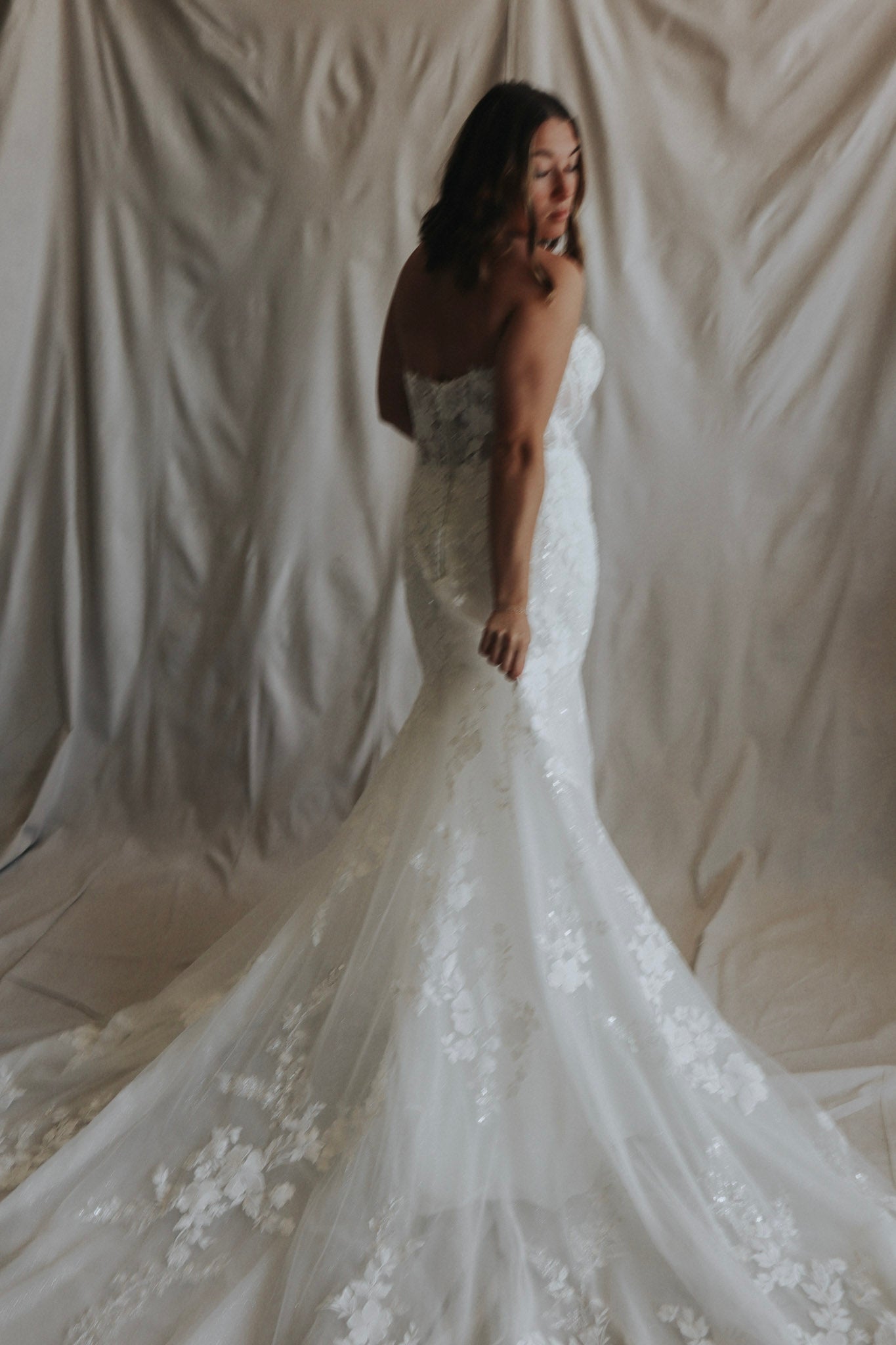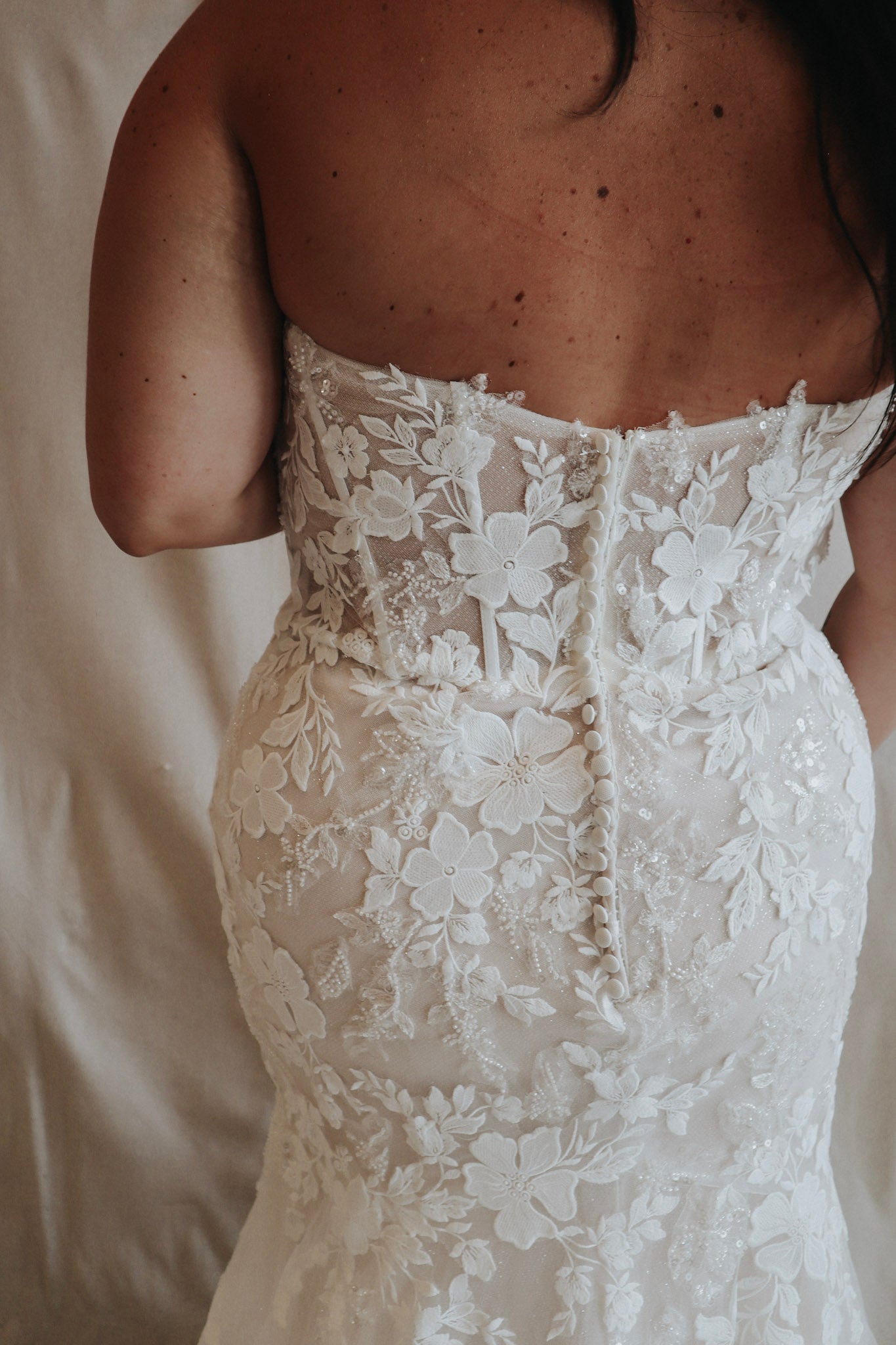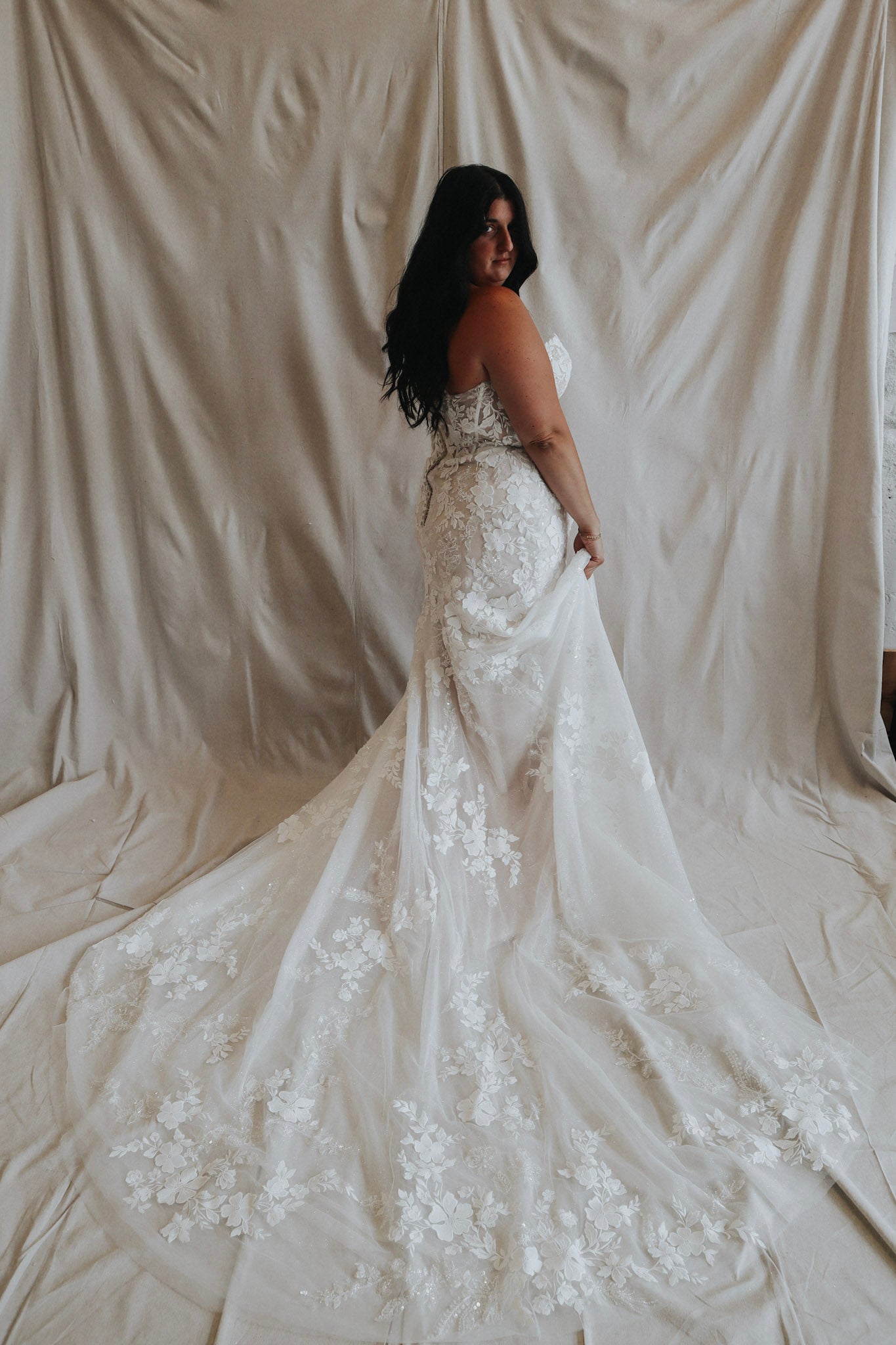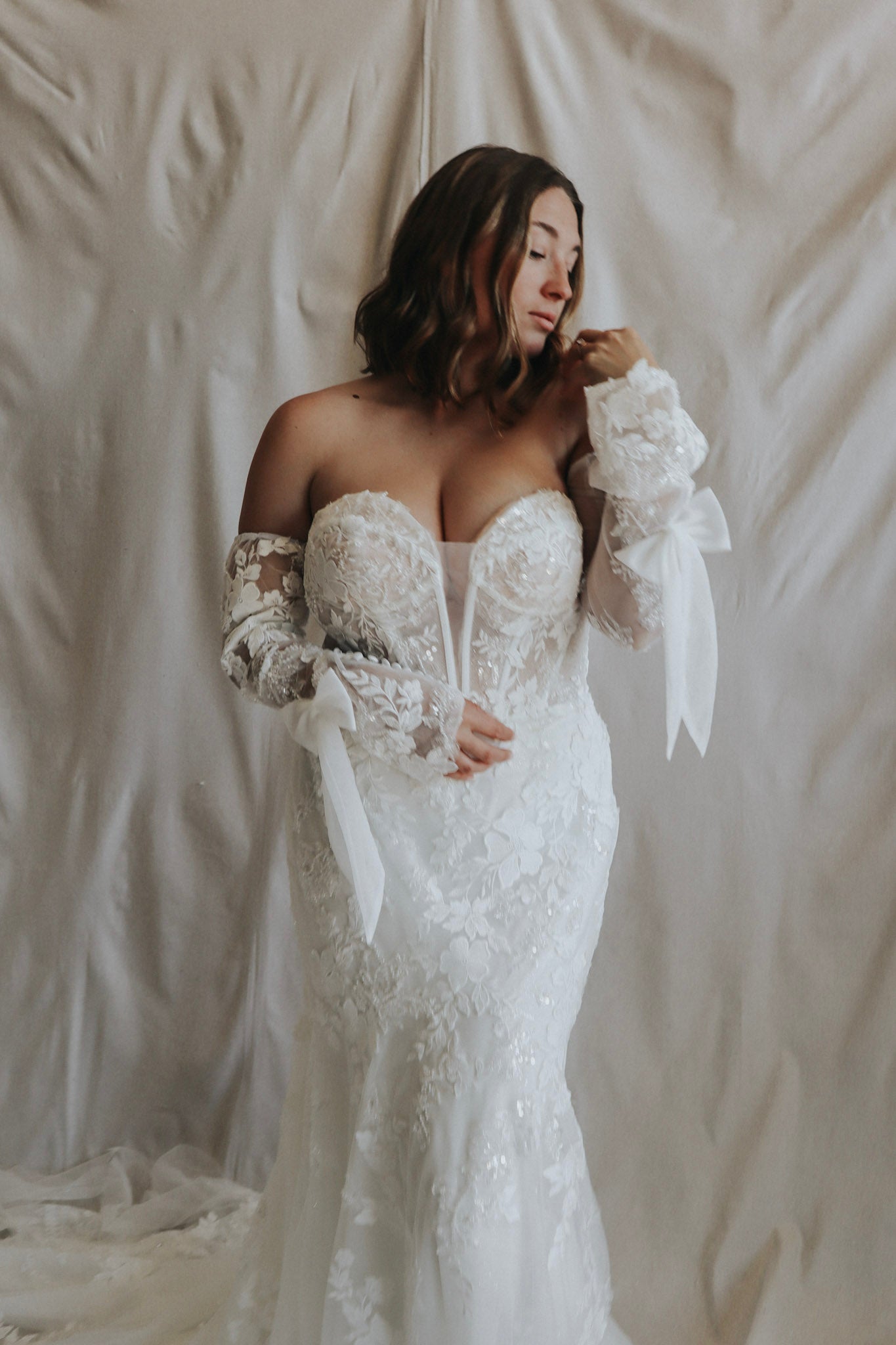 Introducing "Helen," a captivating fit and flare wedding dress that exudes modern elegance and allure. This gown features a strapless neckline with a deep V-neckline, beautifully enhancing the bride's décolletage. The corset-style mesh bodice is adorned with intricate lace throughout, adding a touch of romantic sophistication and structural support. Helen also includes detachable long sleeves crafted from matching lace, offering versatility and a hint of coverage. Perfectly blending contemporary style with timeless grace, Helen ensures a stunning silhouette and unforgettable bridal presence on her special day.