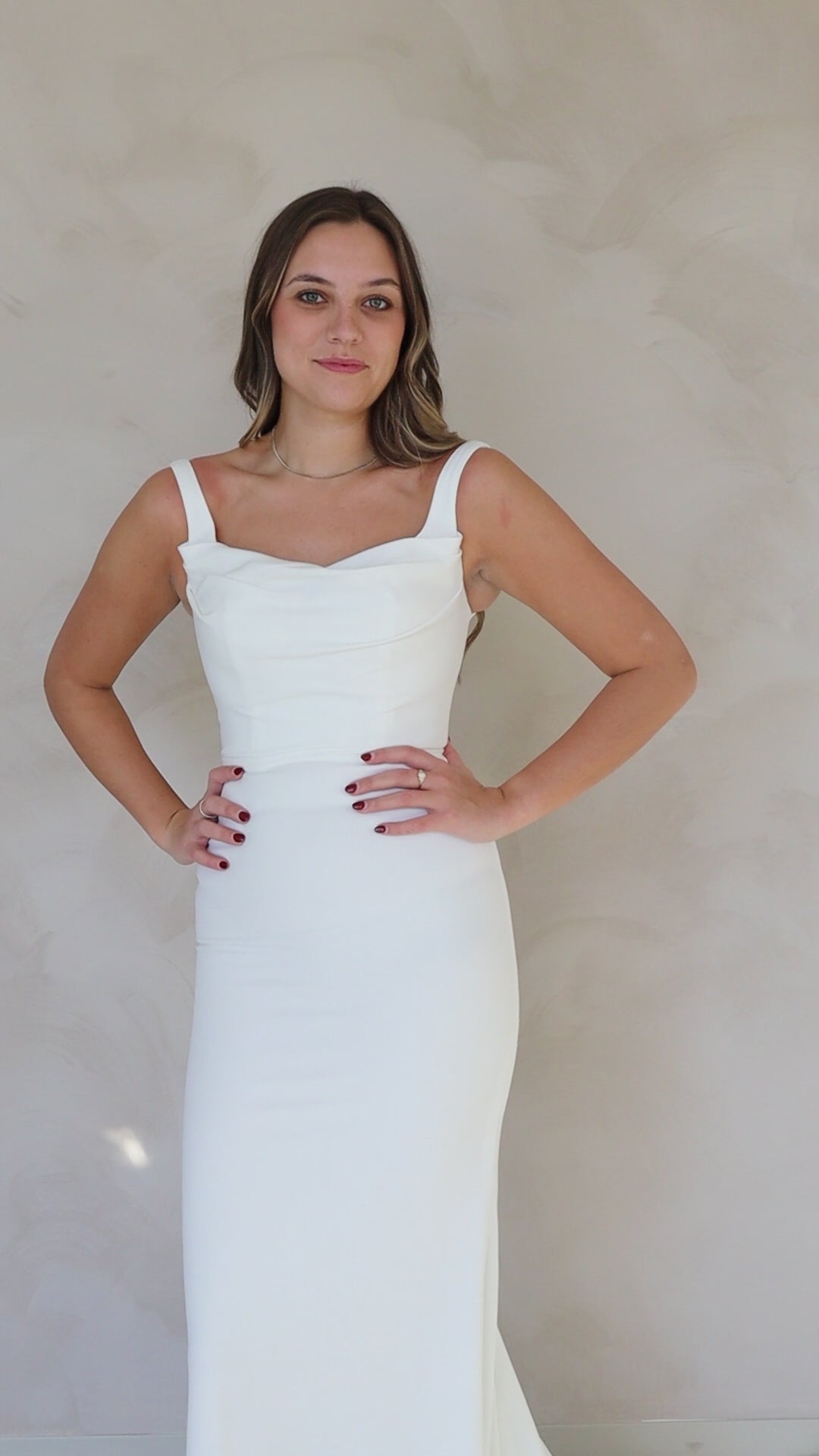 Aire, a stunning embodiment of effortless sophistication crafted from luxurious stretch crepe in timeless vintage white. featuring wide-set straps for enhanced bust support and comfort. The clean-lined silhouette and elegant cowl neckline create a refined elevated look. Designed with comfort and structure in mind, Aire boasts built-in bra cups, boning, and soft fusing to ensure impeccable bodice construction. The fitted sheath silhouette flatters every figure, while the scoop back adds a touch of allure to the overall design. Aire is as practical as it is beautiful, featuring an invisible zip closure for a seamless finish, complemented by faux button detailing at the back for added sophistication.