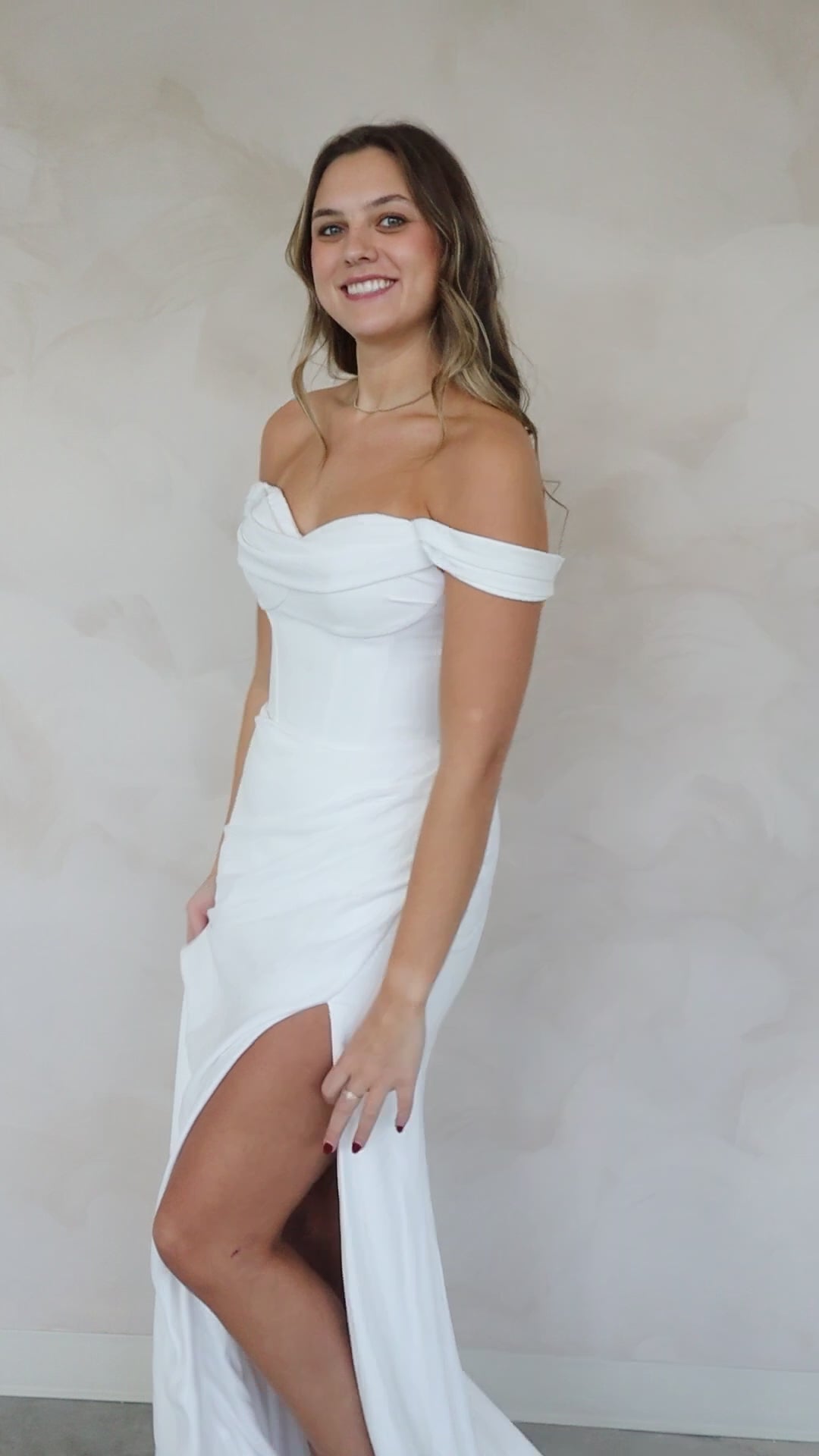 Off-the-shoulder sleeves enhance the romantic feel, while a soft V-back with an invisible zipper, loop, and buttons adds sophistication. The fitted mermaid silhouette is accentuated by a thigh-high split and pleating from the left hip. With exposed boning and bra cups for support, this gown also features a court-length train, making it perfect for the bold bride who wants to make a statement on her special day.