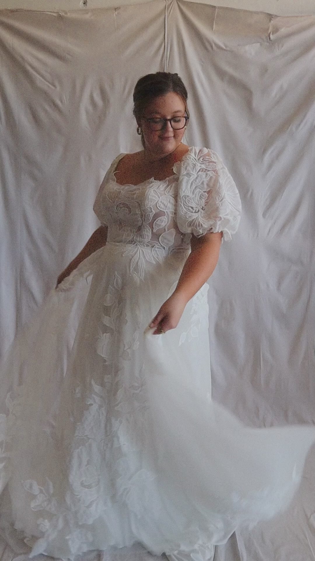 Introducing "Bea," a romantic A-line wedding gown adorned with delicate floral appliqué throughout. The gown showcases a graceful square neckline and charming puff short sleeves, blending whimsical charm with timeless elegance. A flowing train completes the ensemble, ensuring Bea captivates hearts and creates unforgettable moments on your special day with its effortless beauty.