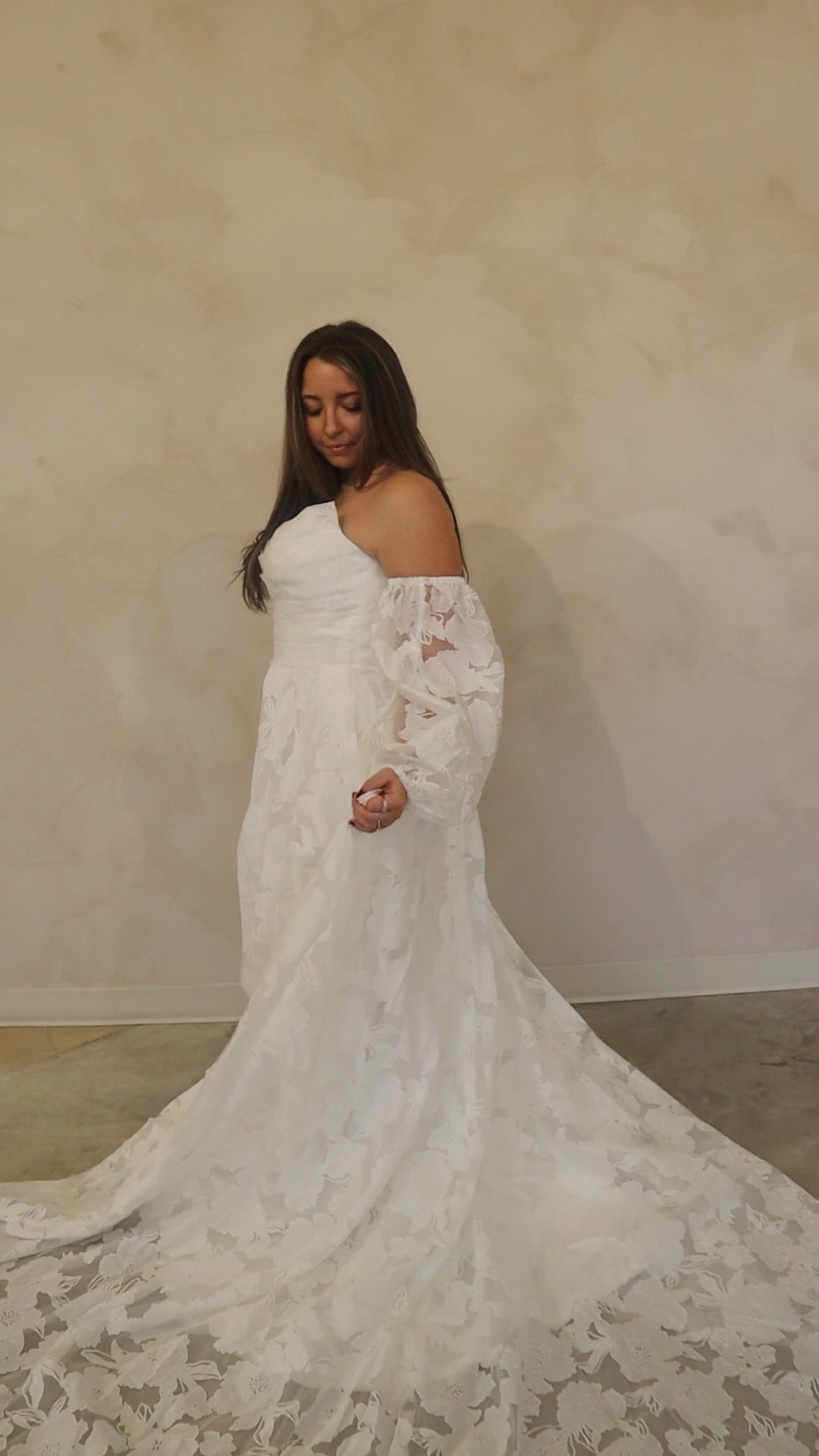 Introducing "Bella" a modern aline wedding dress with large floral motifs throughout the entirety of the gown. Bella has a soft shape and features a rushed bodice, complete with removable long sleeves. Bella has a large flowing train that enhances its beauty.