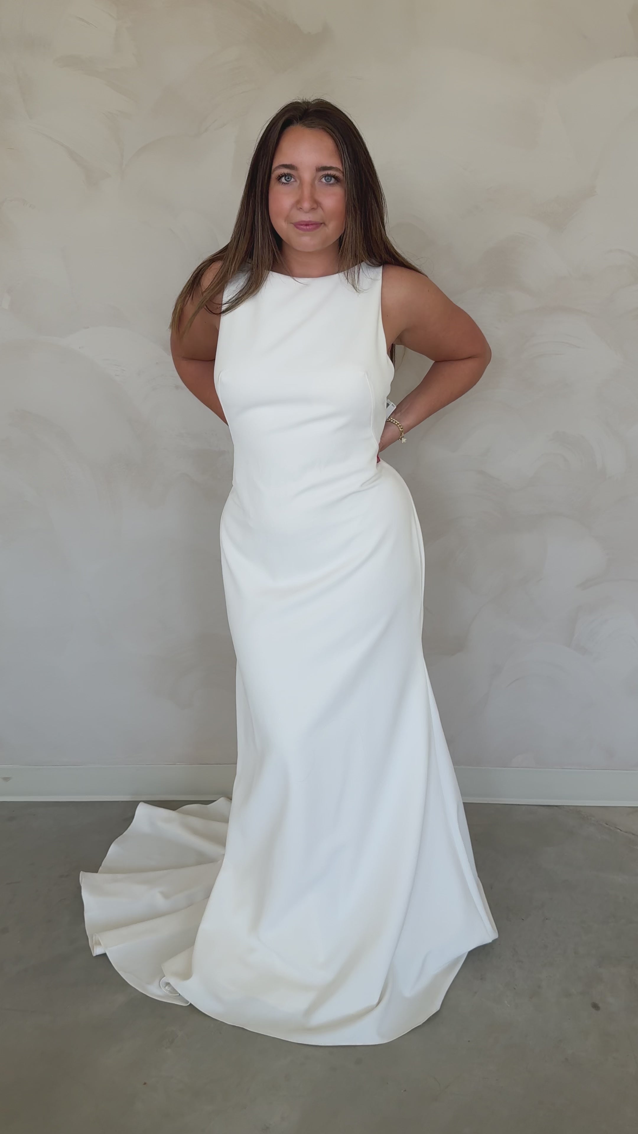 The Celeste Wedding dress by Tania Olsen Designs is a striking vintage inspired gown that is both unique and oh so classy. The Celeste features a glamorous high boat neckline, low arm openings and and a bodice with darting for the perfect fit through the middle. This dress has flat straps that fall to a low exposed scoop back, which is where the detachable bow fastens. The Celeste has a stunning fit and flare mermaid silhouette, which helps to create drama and movement on the body of the wearer.