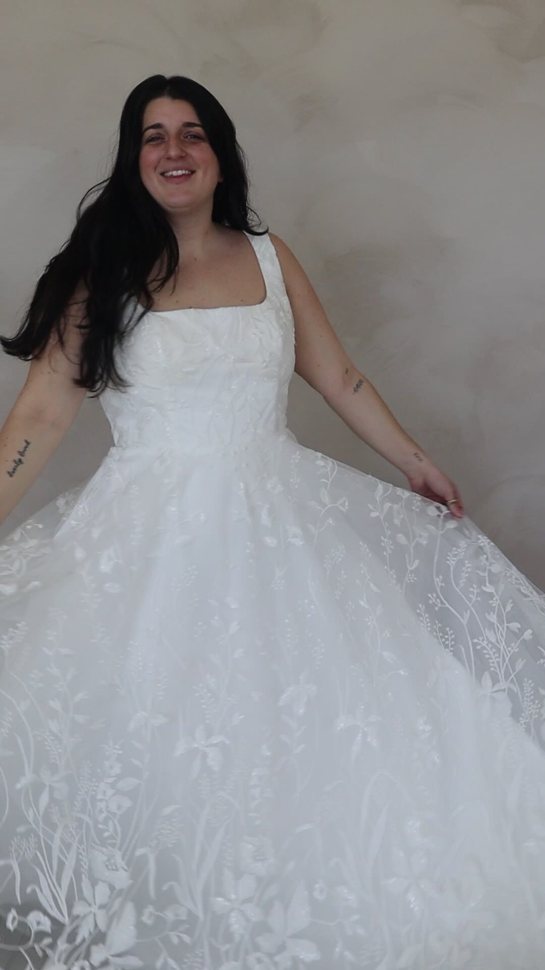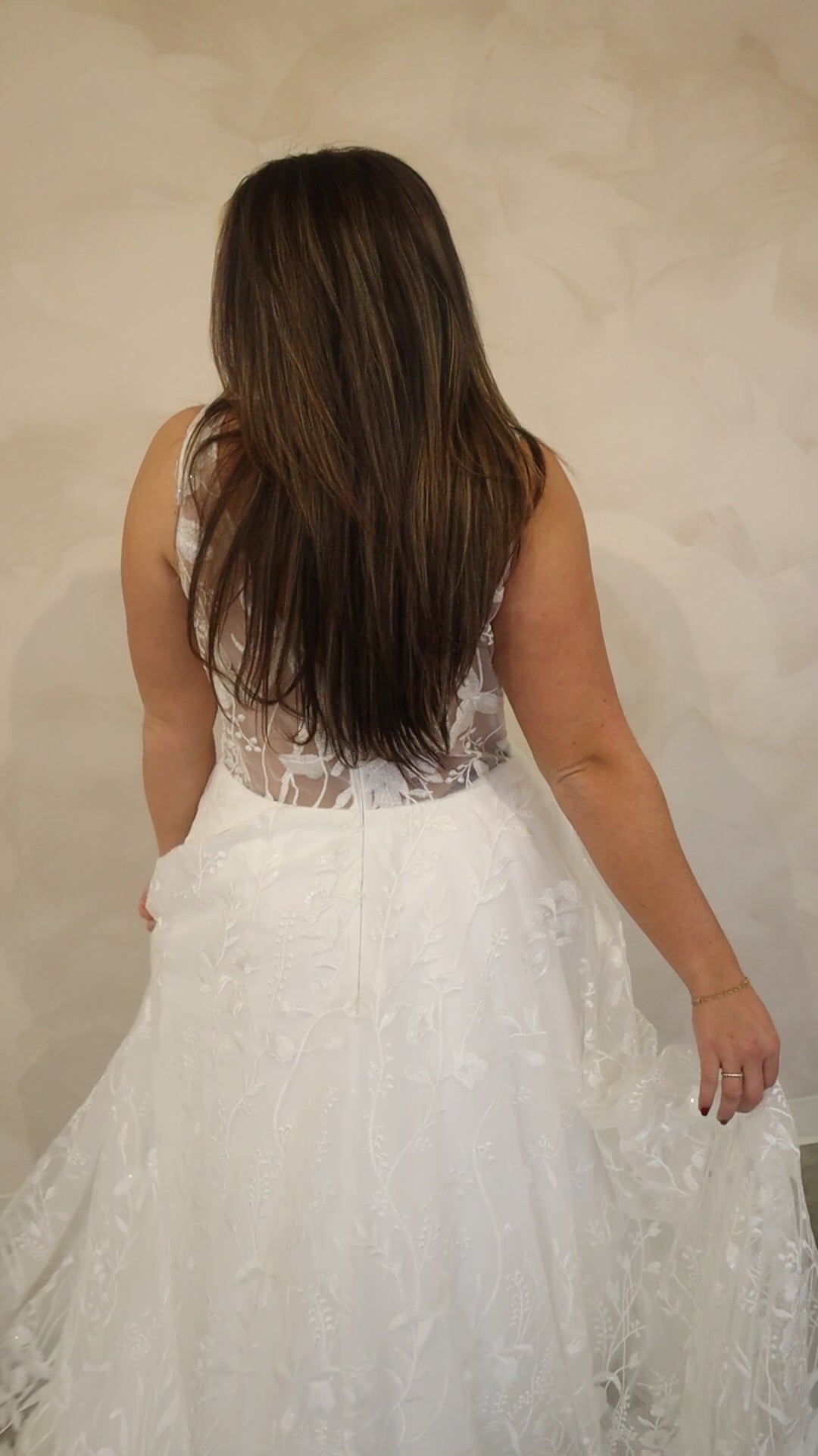 Introducing "Fleur." Fleur is an aline wedding dress with gorgeous lace and sparkle throughout. Fleur has an enchanting square neckline, paired with a mesh backline that can easily be filled for extra comfort. Fleur is light and flowy and has a small sweep train to complete its fairytale look.