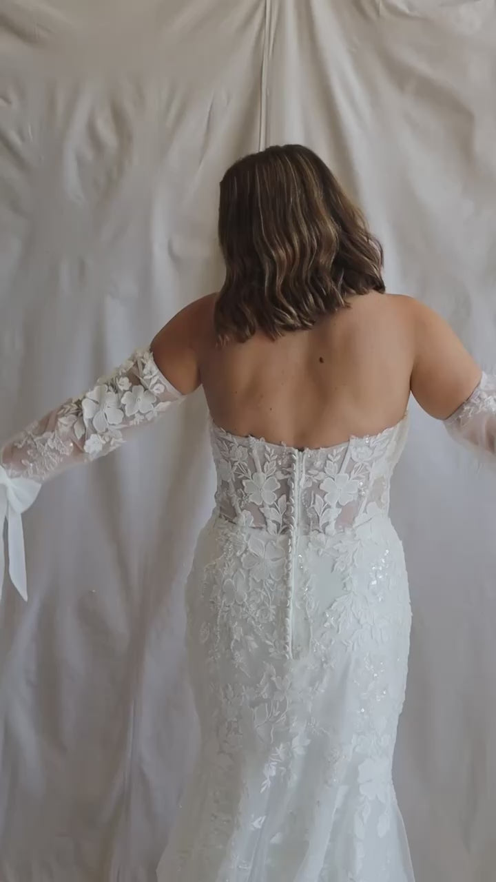 Introducing "Helen," a captivating fit and flare wedding dress that exudes modern elegance and allure. This gown features a strapless neckline with a deep V-neckline, beautifully enhancing the bride's décolletage. The corset-style mesh bodice is adorned with intricate lace throughout, adding a touch of romantic sophistication and structural support. Helen also includes detachable long sleeves crafted from matching lace, offering versatility and a hint of coverage. Perfectly blending contemporary style with timeless grace, Helen ensures a stunning silhouette and unforgettable bridal presence on her special day.
