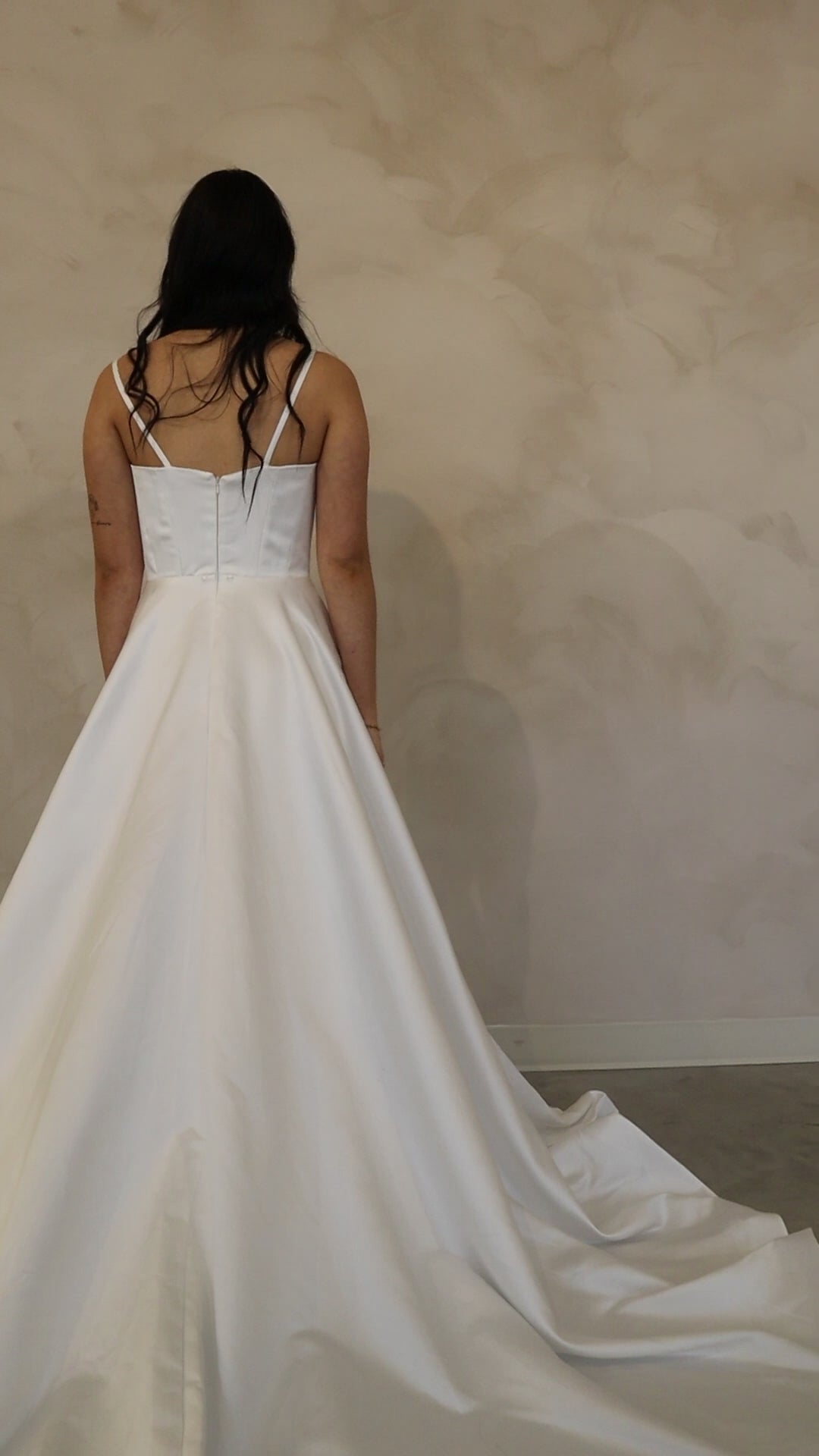The Ida Wedding Dress features a timeless A-line silhouette crafted from luxurious satin. With a pleated cowl neck and a flattering dip waist, this gown is both elegant and sophisticated. Delicate spaghetti straps lead to an oversized bow at the back, adding a playful touch, while the chapel-length train flows beautifully behind. The bodice is designed with an internal corset and bra cups for a perfect fit. Ideal for the bride who embraces classic charm with a modern twist.