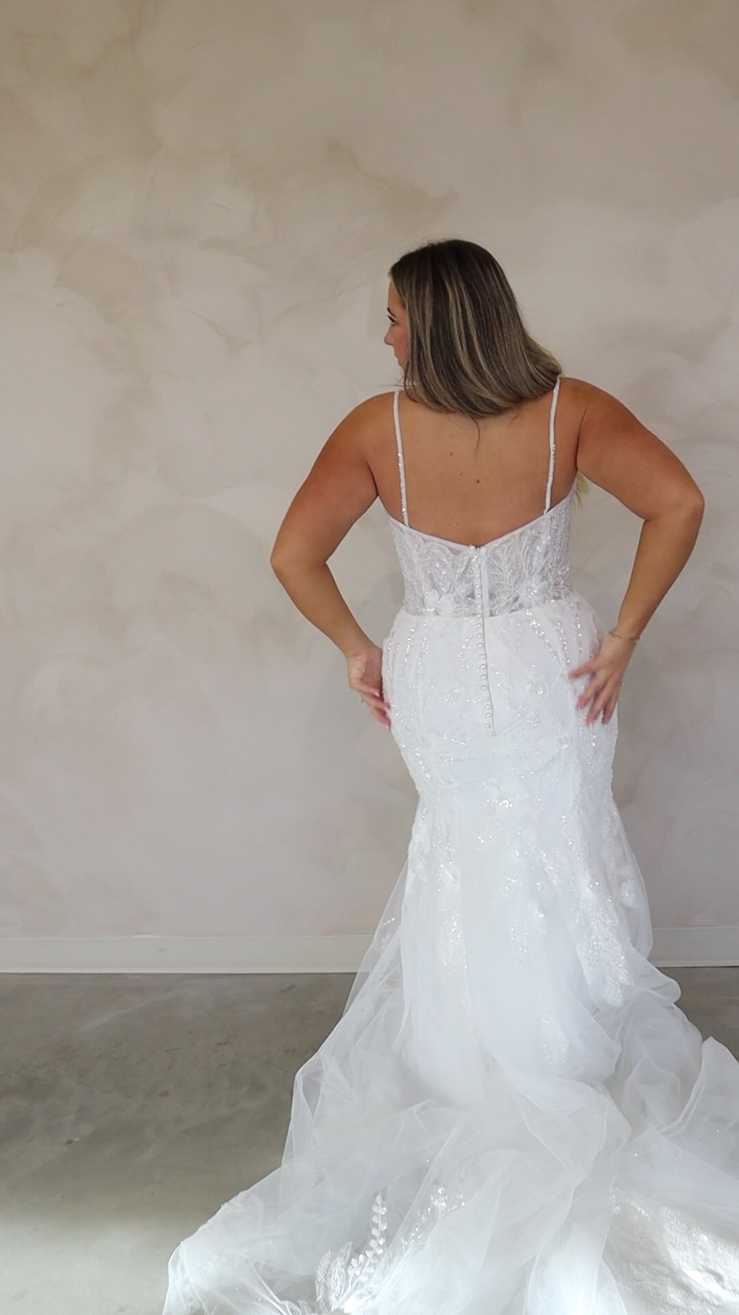 Introducing "Reece"- Make a stunning entrance in this A-line wedding dress, featuring a sheer bodice with delicate floral appliqués and shimmering sequins. The soft, flowing skirt with a lace-edged train offers a graceful silhouette, perfect for the bride seeking both modern glamour and timeless elegance. Available now at Dearly Bridal.
