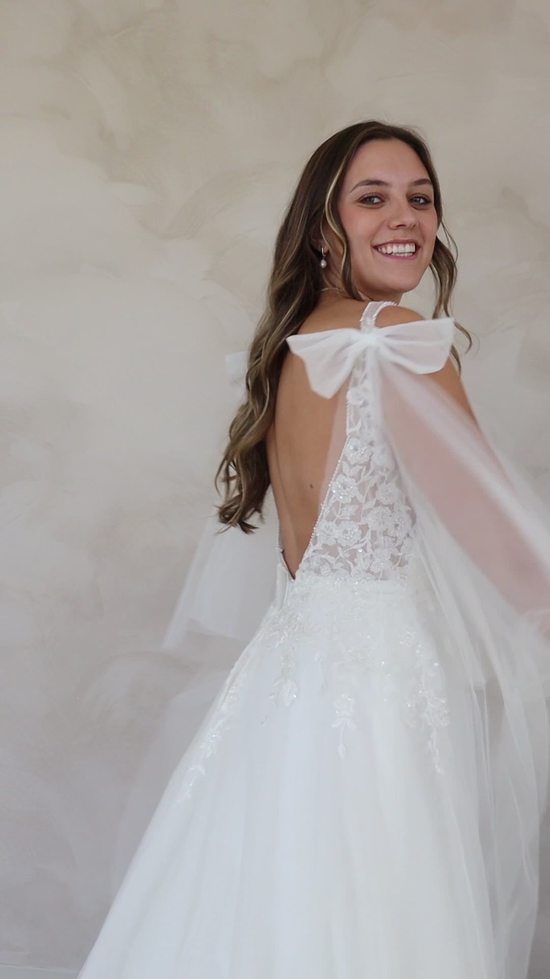 Experience modern romance in Rosalba. This lace and tulle masterpiece boasts a plunging neckline with sheer lace, detachable back bows, and chic tulle side cutouts. With built-in support and a sultry plunging v-back, it ensures effortless elegance. Complete with an invisible zip, this floor-length A-line gown is available in Vintage White & Vintage White/Pink Rum. Perfect for the bride who embodies contemporary sophistication with ease.