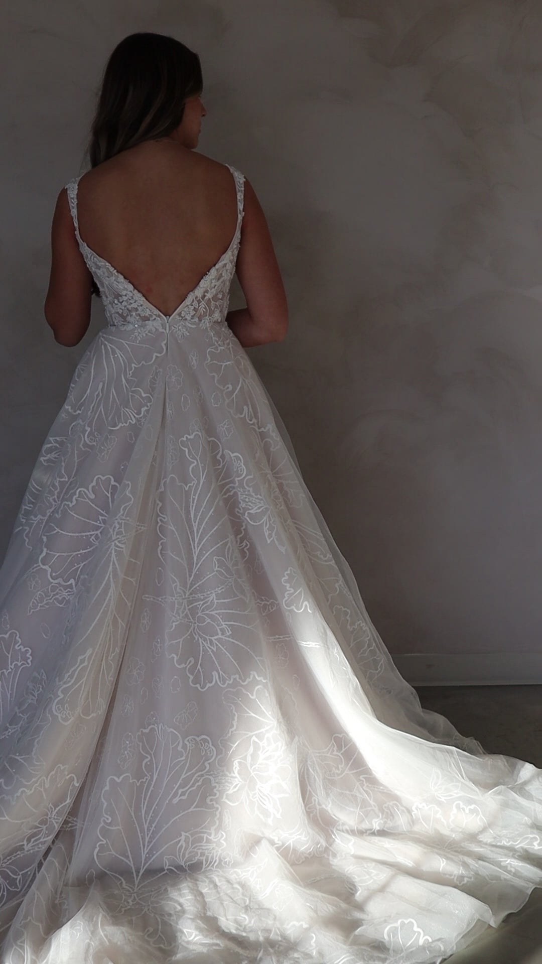 The Clara wedding dress, a timeless A-line silhouette. Adorned with delicate lace applique and exposed boning, the illusion bodice exudes elegance, while the scoop neckline and soft V back are accented by slightly tapered thick straps for a contemporary touch.