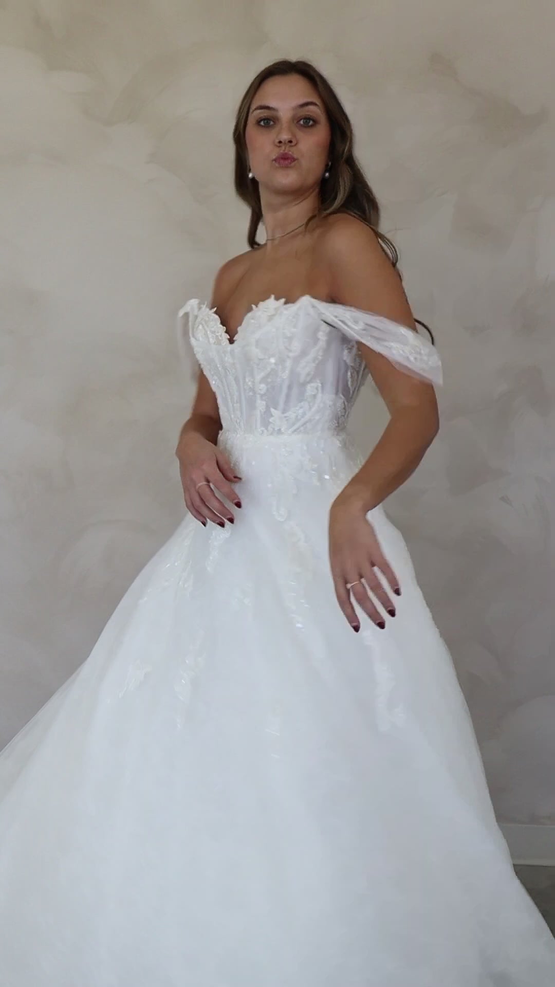 The Elina wedding dress is a modern ballgown with full lace and sparkle throughout, featuring a corset bodice with a sweetheart neckline, off the shoulder straps and horsehair edge trim. Elina has a chantilly lace underlay and a full princess skirt.