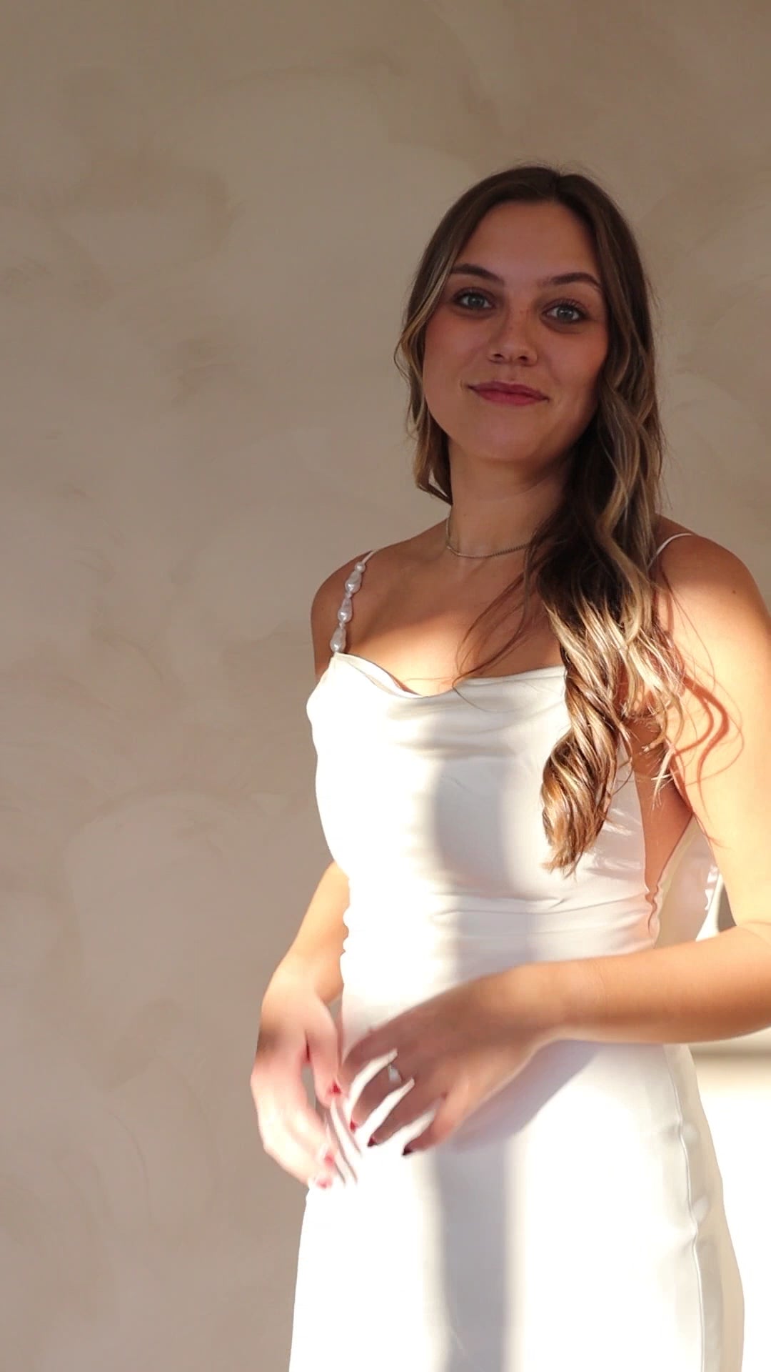 The Soleil wedding dress features a slinky straight silhouette, crafted from bias cut soft satin. Featuring a thigh high split with directional darts to add movement and flow to the skirt. The bodice features a draped cowl neckline with thick cross over back straps with a plunging scoop back. Soleil is a timeless gown that will never go out of style.