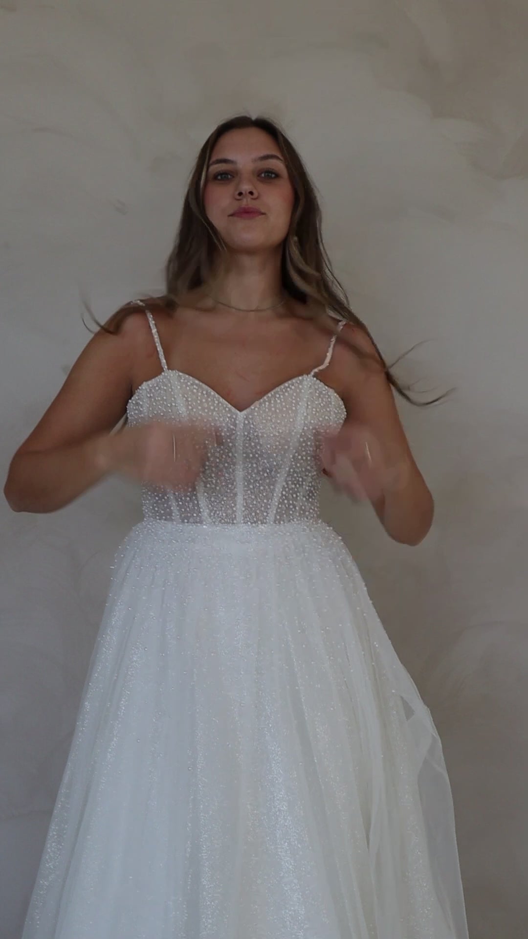 The Enya wedding dress is for the romantics. Her dazzling bodice features a sweetheart neckline, exposed boning and spaghetti straps. Covered in decadent pearls and crystals. The voluminous skirt features layers of sparkle and plain tulle finishing in a chapel length train.