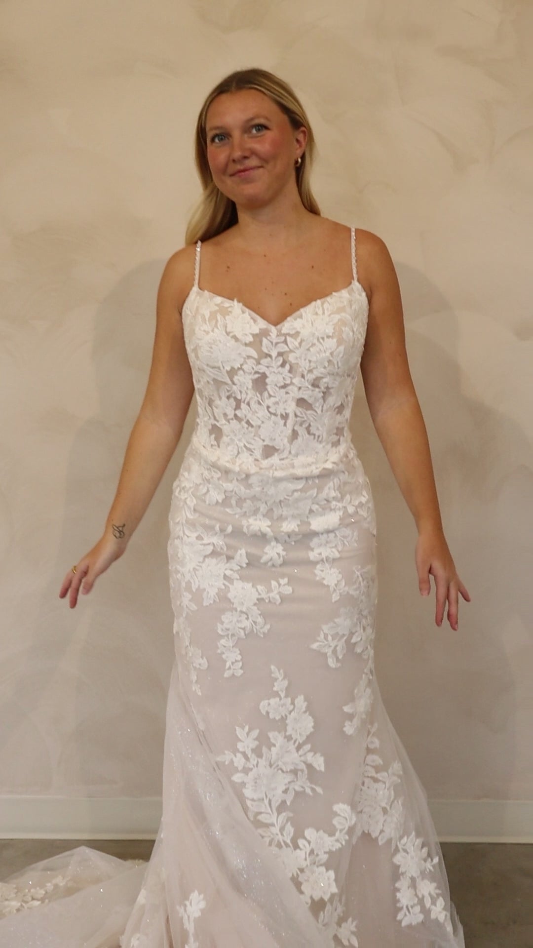 The Bodhi wedding dress is an effortlessly elegant, fitted mermaid silhouette. The illusion bodice features exposed boning with a soft v neckline and delicate beaded spaghetti straps. Floral lace applique is thoughtfully placed over the bodice and covering the full fit & flare skirt. The back skirt features a sweep length train.