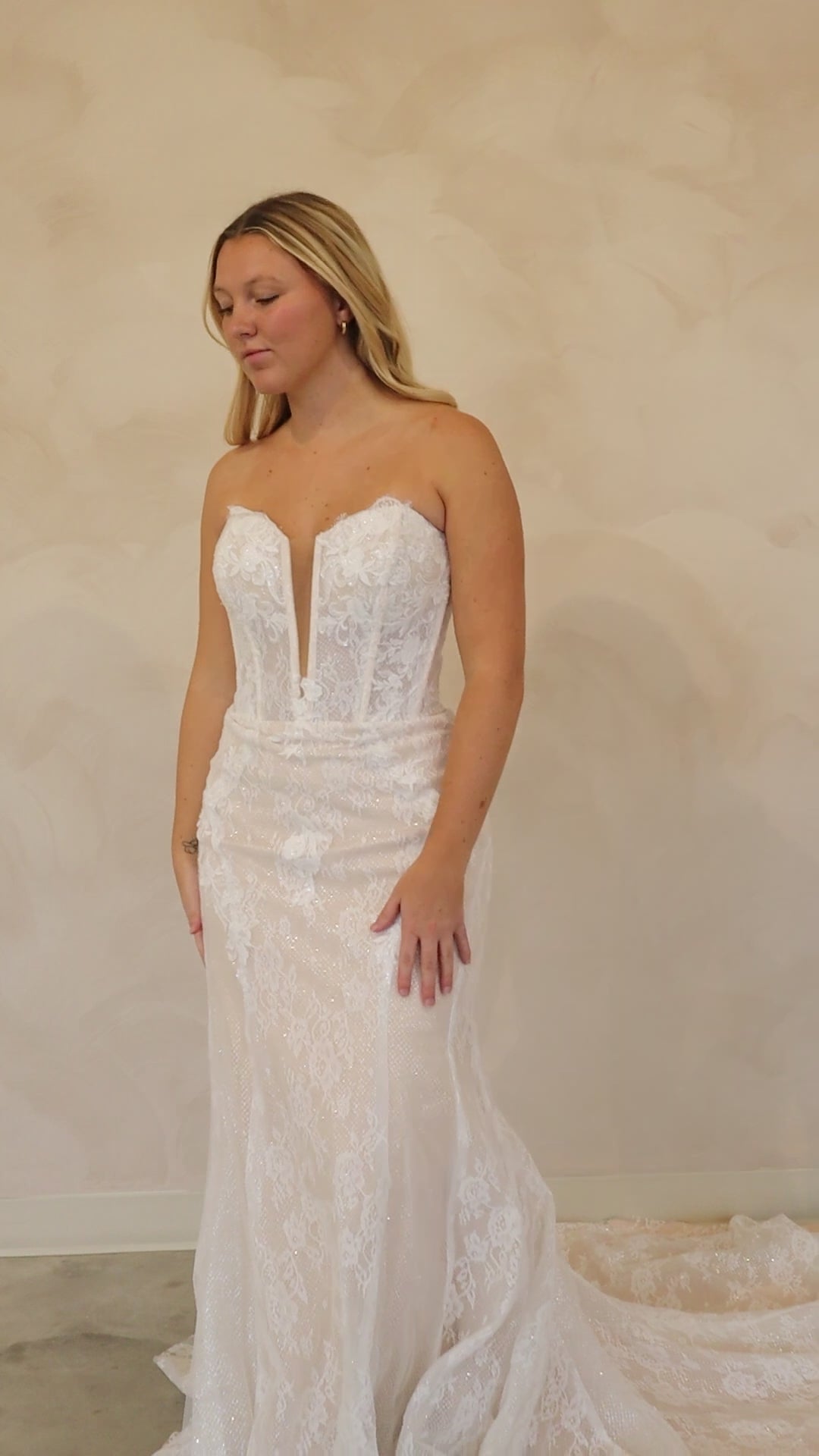 The Inara wedding dress is for the bride looking for a modern dress with traditional flare. Inara features a strapless sweetheart bustier with a deep v neck and mesh panel. The bodice is finished with delicate scalloped lace. A harmonious texture is created with layers of sparkle tulle, plain tulle, soft lace and lace applique. The mermaid silhouette features flattering panels to accentuate your figure, finishing in a back skirt train.